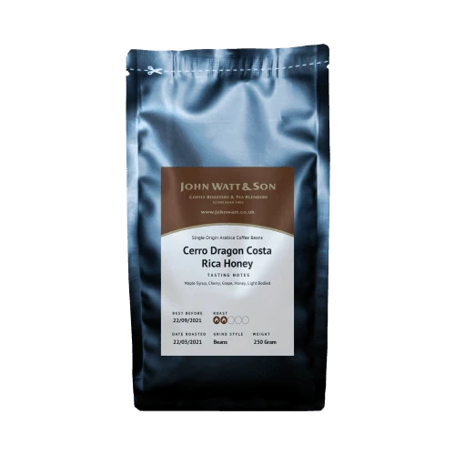 Honey Cerro Dragón Costa Rica is in the San José Province, the farm sits under the shadow of the Cerro Caraigres, the Cerro Dragon mountain massif, which is said to look like a sleeping dragon when seen from the Central Valley. It is owned by Ricardo Valverde Fernandéz, who teamed up with four farmer friends to build their own processing plant which now produces approximately 500 bags of SHB beans per year. Our daughter visited the plant in 2019 and loved the coffee so much that we ordered some from our importers immediately.