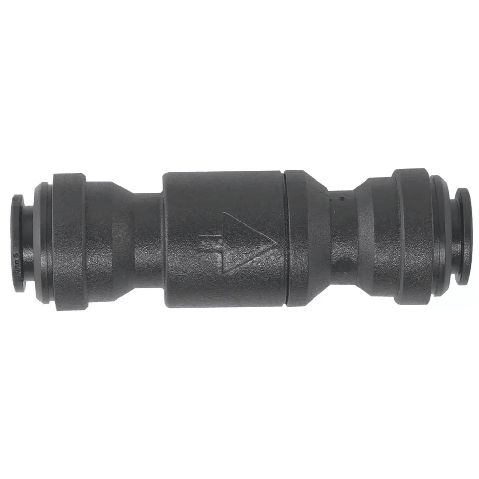 This John Guest 3/8 inch Single Check Valve allows water to pass only one way. Ideal if you have a Rotary pump machine connected to Bottled Water. Allows you to disconnect bottled water supply but still retain water in the pump. Otherwise pump will be sucking air when re-connected which can damage Rotary pumps. Perfect for home users caterers and other mobile locations that don’t always have access to mains water.