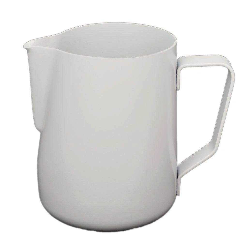 Thick and heavy:Â Underneath the coating is a 1mm thick food grade stainless steel body which provides better stretch time for texturing milk. This is ideal for both the 12oz and 20oz sized pitchers. The thicker steel also provides a great weight and professional feel.